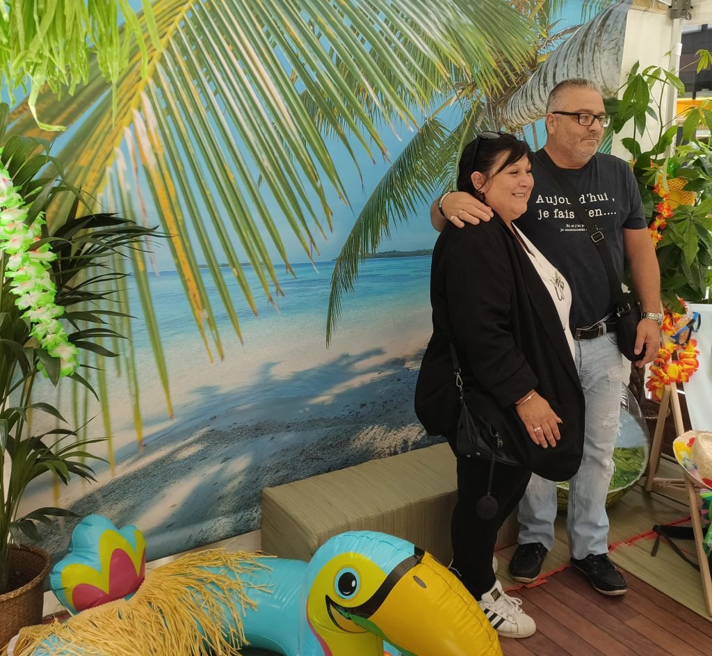 De nombreuses décorations vous sont proposées avec notre borne selfie. Ici : une mise en ambiance « paradisiaque » avec comme décor : plage, palmiers, bouées, hamac, transat et couronnes de fleurs.