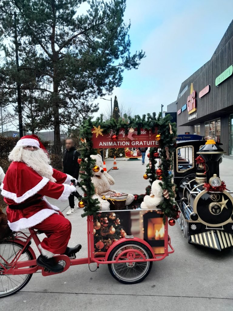 Personnalisation d’un triporteur aux couleurs et décorations de noël permettant de déambuler dans le retail