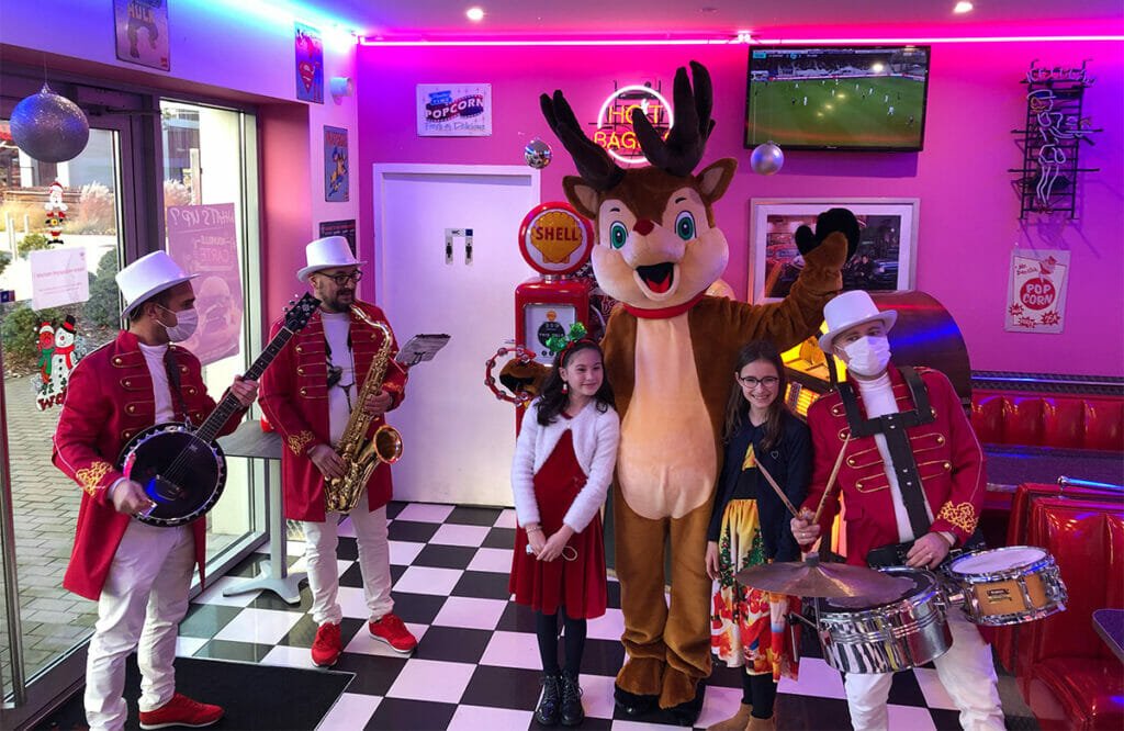 Nous vous proposons une Fanfare de Noël et sa mascotte renne.