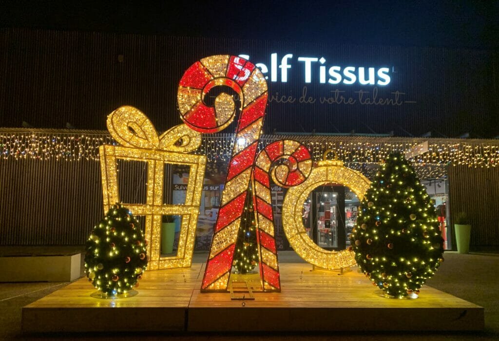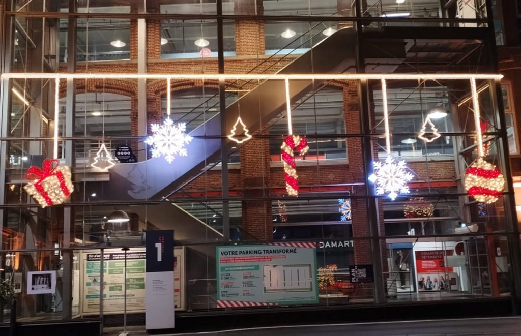 Création complète d’une valorisation de façade d’un retail. Combinaison des symboles de décorations « classiques » : sure d’orge, cadeau, boule et sapins avec leds rouges et blanc chauds. Présence de flocons plus moderne (2m d’envergure) et structure visible de l’ensemble avec cordons leds blanc chaud.