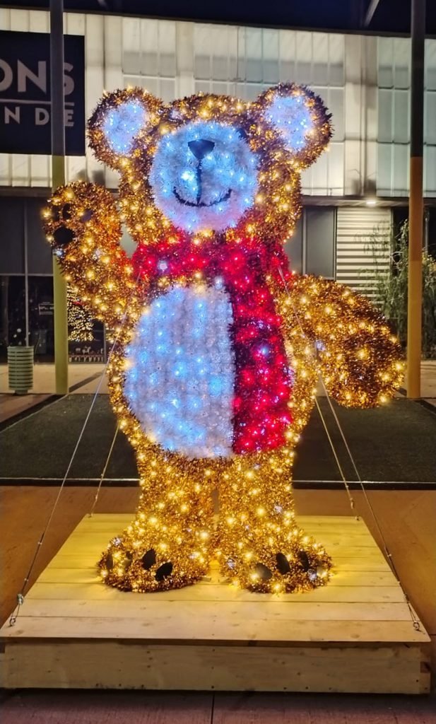 Création d’un Teddy leds et tapis de sapin de 2m à 3.50m Enorme impact pour les enfants et particulièrement apprécié par nos clients car visible de jour comme de nuit.