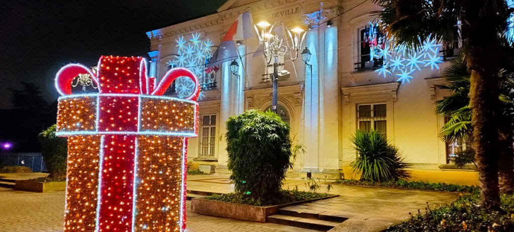Cadeau (3m) lumineux offrant une décoration visible de jour comme de nuit devant une mairie