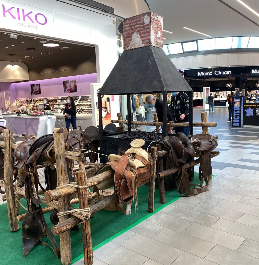 Reconstitution d’une forge typique des grandes chevauchées Américaines. Collection de différentes selles de chevaux installées sur des barrières en bois.