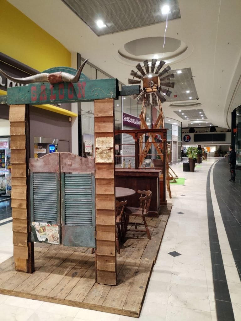 Mise en place d’un saloon avec nombreux accessoires : table, chaises, comptoir. L’entrée du saloon est typique de ceux que l’on trouvait dans les villages improvisés lors de la ruée vers l’or. Le sol reprend l’aspect brut d’un parquet d’antan.