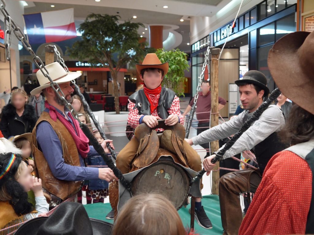 Module itinérant adoré par les enfants. Il transporte les cowboys en herbe dans les allées du centre commercial.