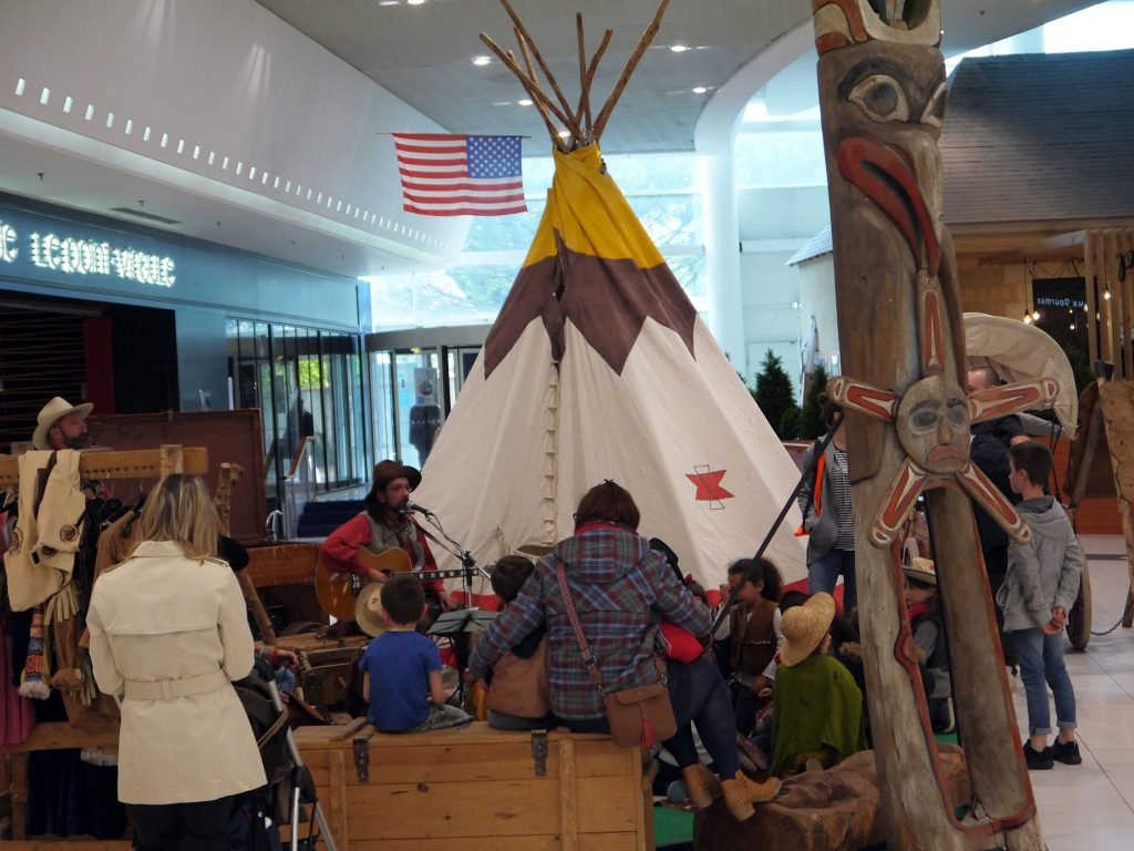 Nos artistes joueront plusieurs fois par jour des morceaux emblématiques de la culture Américaine. Installation d’un bivouac avec : chuck wagon (chariot western), faux feu, caisses de munitions,selles américaines sur chevalet et divers éléments de décor sur une moquette verte.
