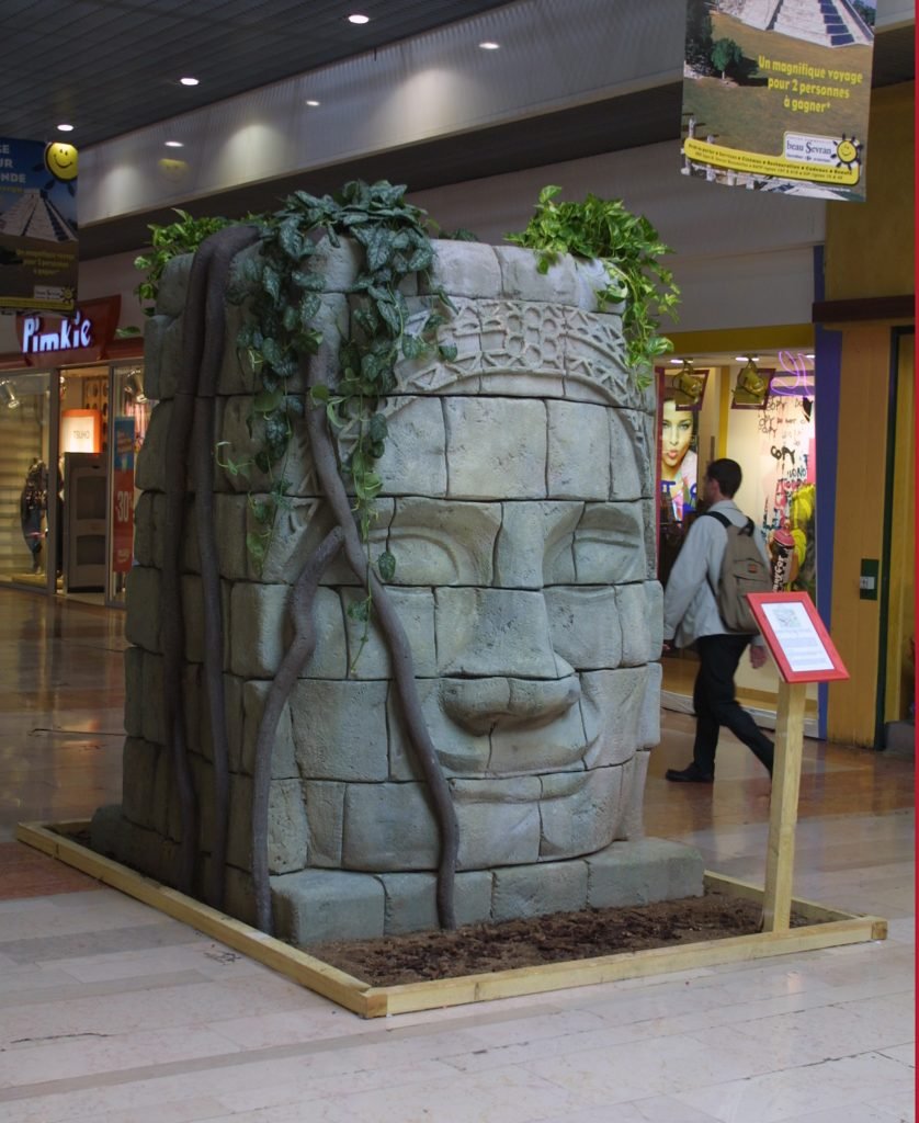 Inspirée de la tête du pharaon « Ramsès », cette sculpture impose par ses dimensions : 4 x 3 x 1.70m posée sur du sable agrémentée de quelques décorations (cartouche, colonne, palmiers…)Totem amérindien avec figurines représentatives d’animaux symbolisant une force naturelle