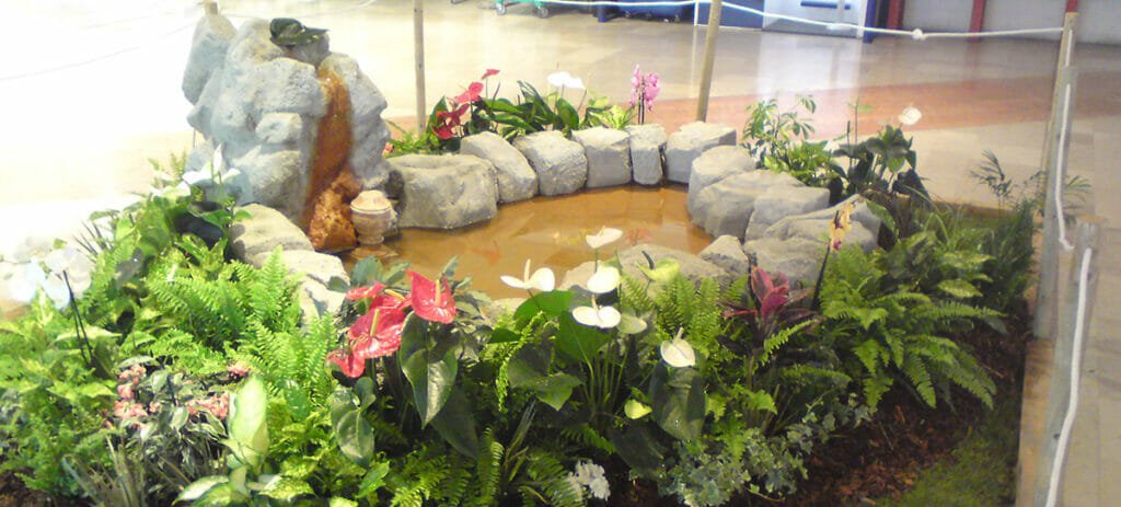Bassin avec écoulement d’eau (contour imitation pierre) Rocher zen avec de nombreuses fougères, bambous et fleurs