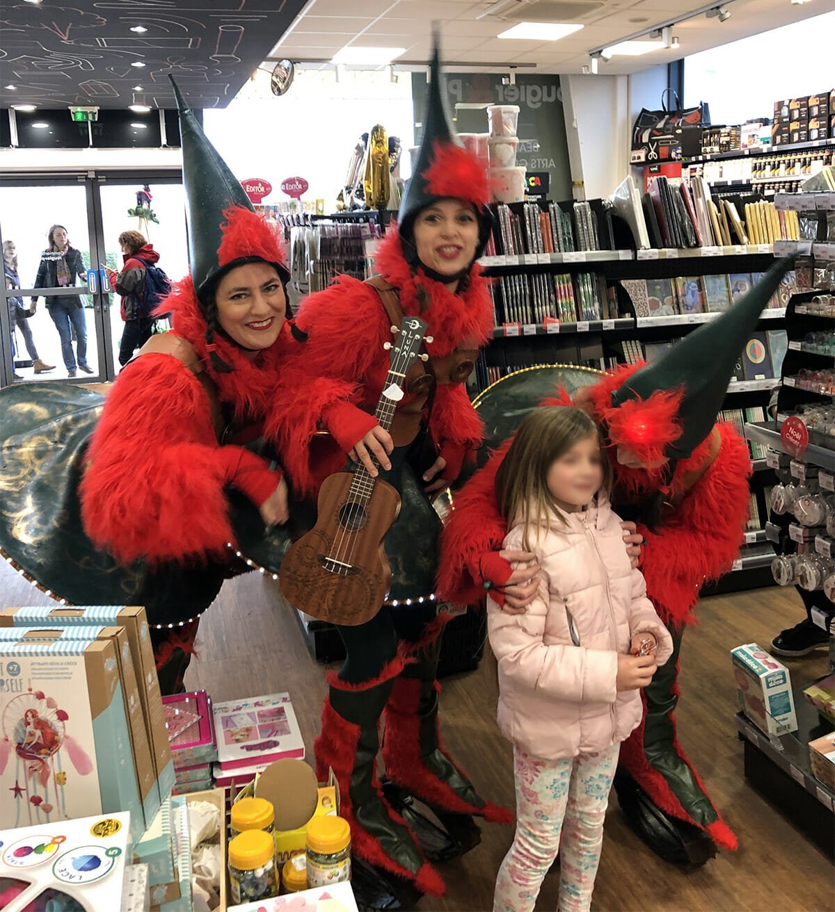 Nos artistes « lutins » sont farceurs, joueurs et musiciens. Un mélange idéal pour votre centre commercial, retail ou commune.